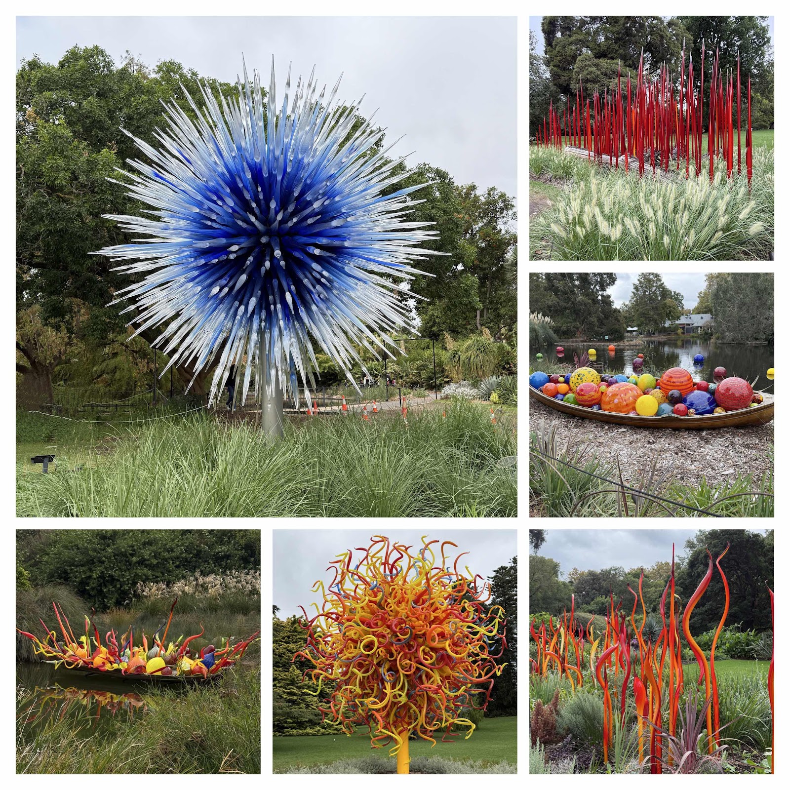 As it was a public holiday we decided to go for a walk around the Botanic Gardens. Peter had not seen the Chihuly Exhibition so it was an opportunity for him to view this. Although the displays were the same it looked a little different due to the cloudy weather. When I visited with my sister back in October 2024 we had beautiful sunshine and the displays seem to sparkle. Here is a collage of some of the artwork by Chihuly.
